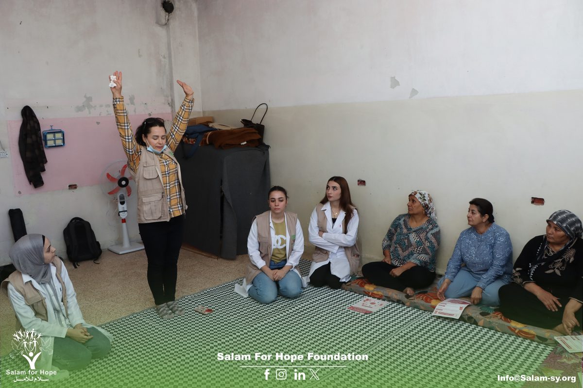 ضمن فعاليات الشهر الوردي، نفّذ الفريق الصحي في مؤسسة سلام للأمل جلسة توعية في أحد مراكز الإيواء بمدينة الحسكة، حول سرطان الثدي، بهدف رفع الوعي لدى السيدات حول أهمية الكشف المبكر ودوره في الوقاية وإنقاذ الحياة.